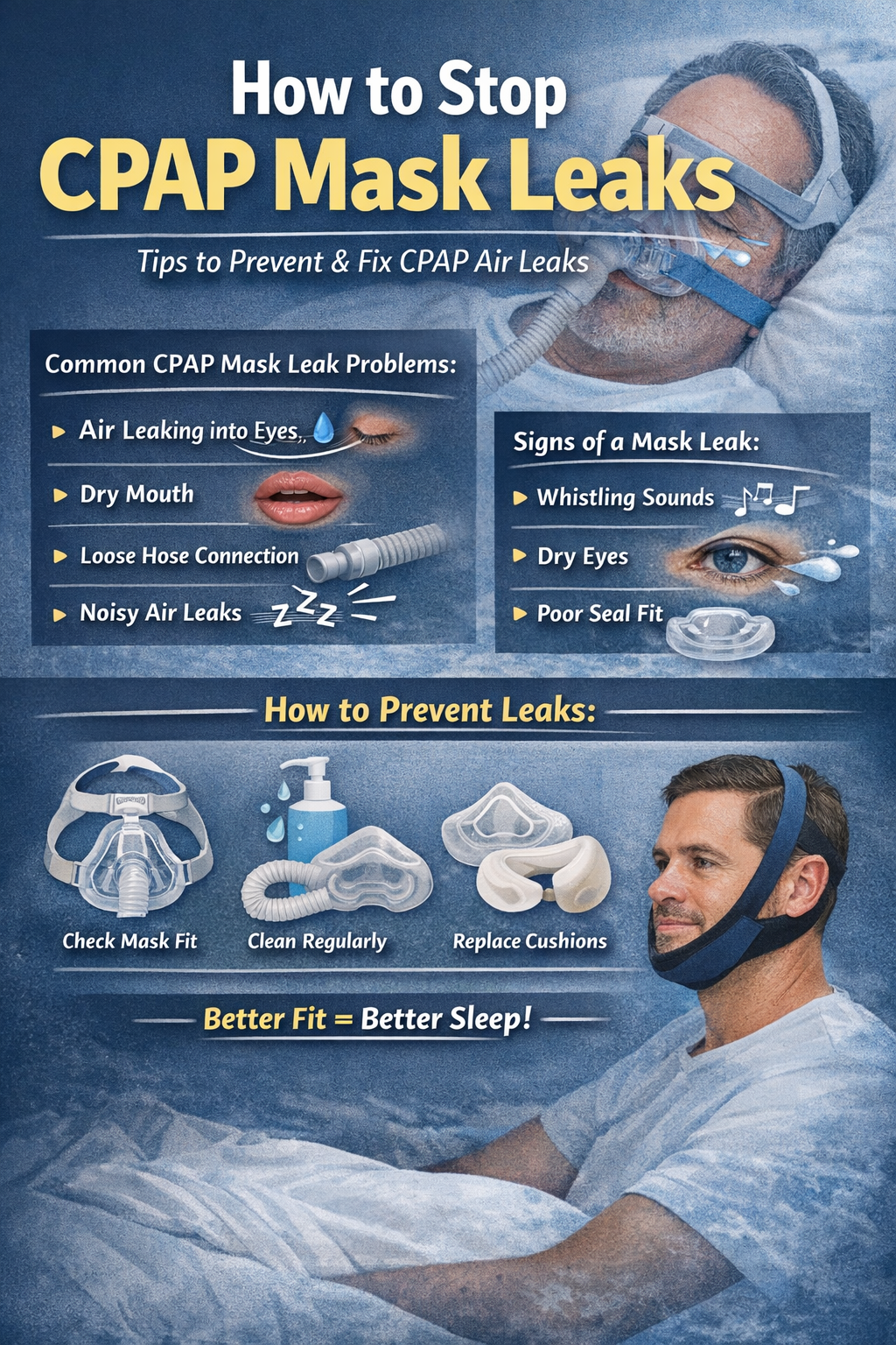 CPAP mask leaks are common, but they are usually easy to fix. By choosing the right mask, keeping it clean, replacing worn parts, and making small adjustments, you can reduce leaks and make your CPAP therapy more comfortable and effective.